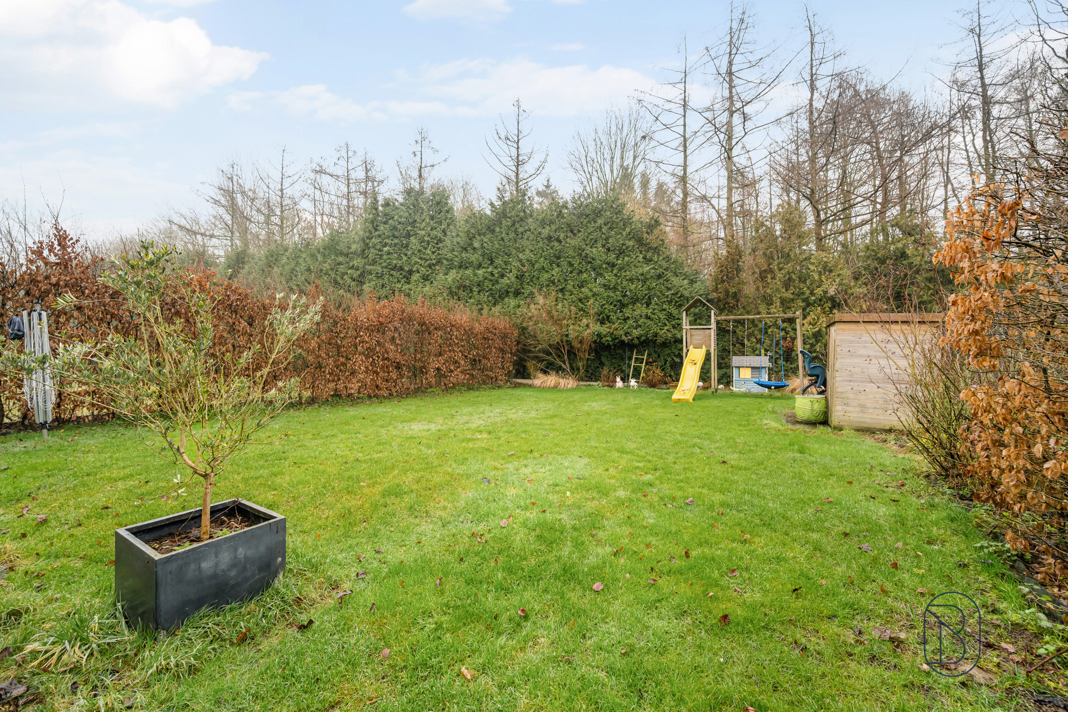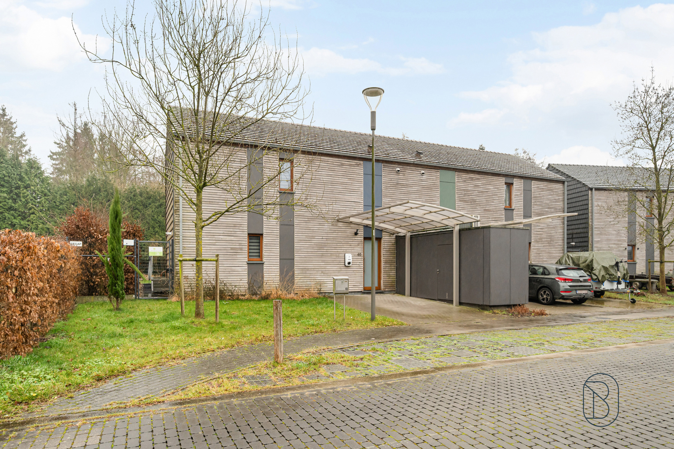 A l’extérieur : Un beau jardin idéalement orienté S/E, arboré et clôturé, une terrasse ainsi que du parking privatif et un carport en devanture.