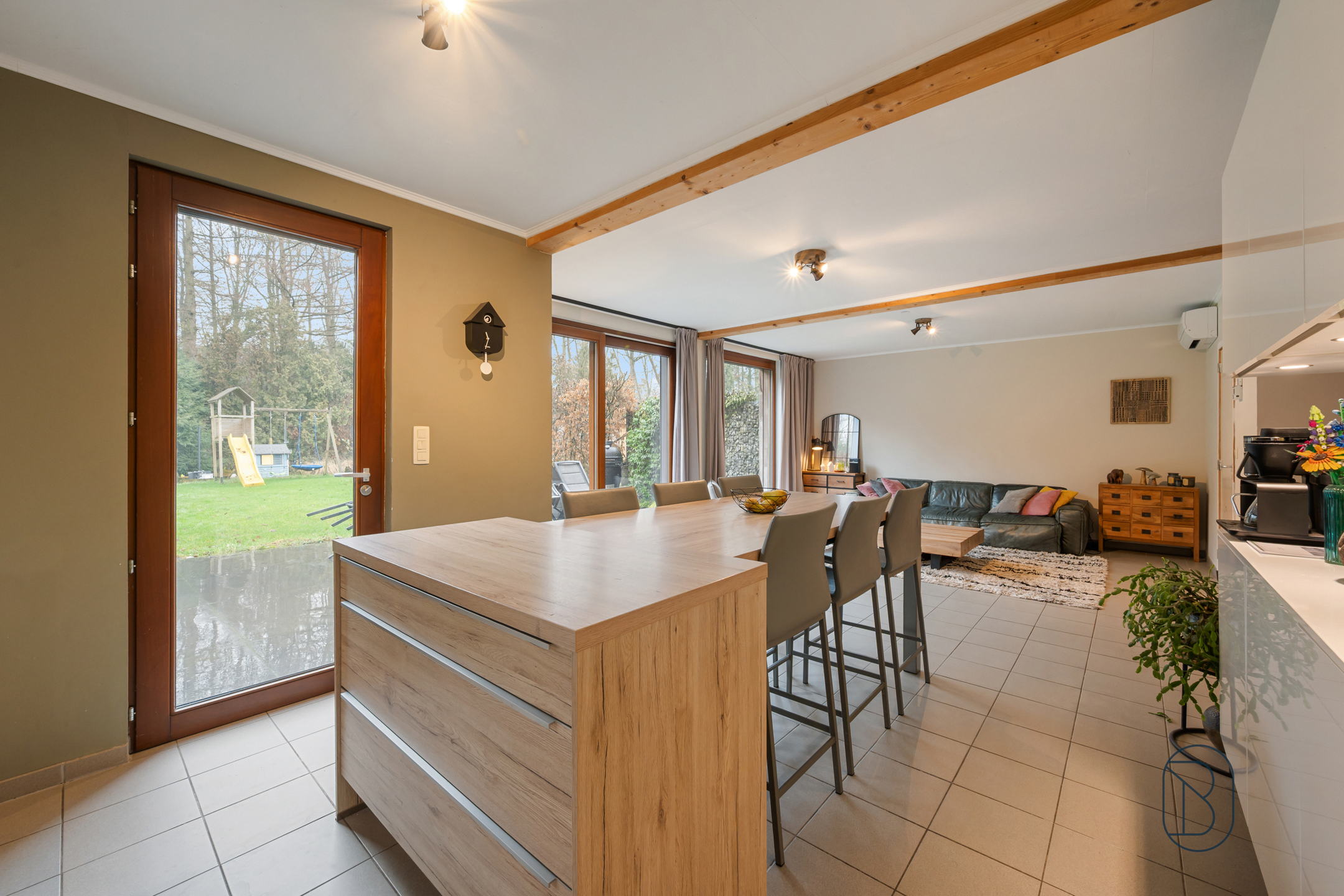 Au rez-de-chaussée : Un hall d’entrée avec WC séparé, une belle et lumineuse pièce de séjour ouverte sur une cuisine équipée moderne, une buanderie