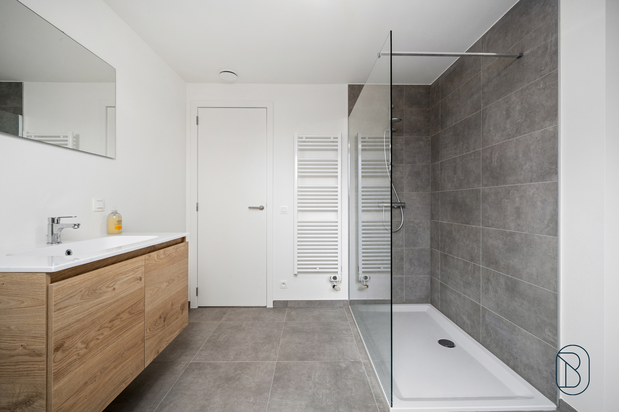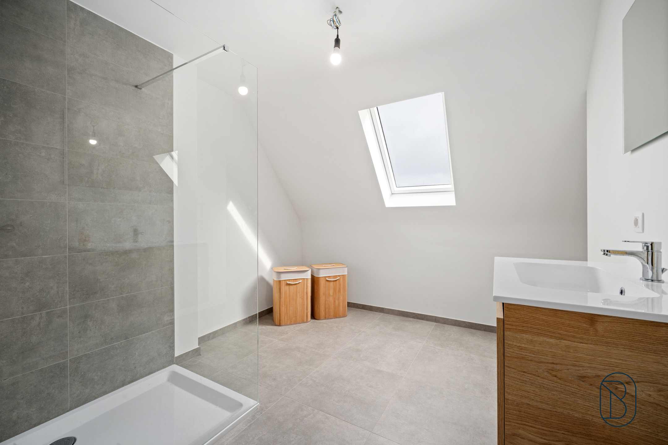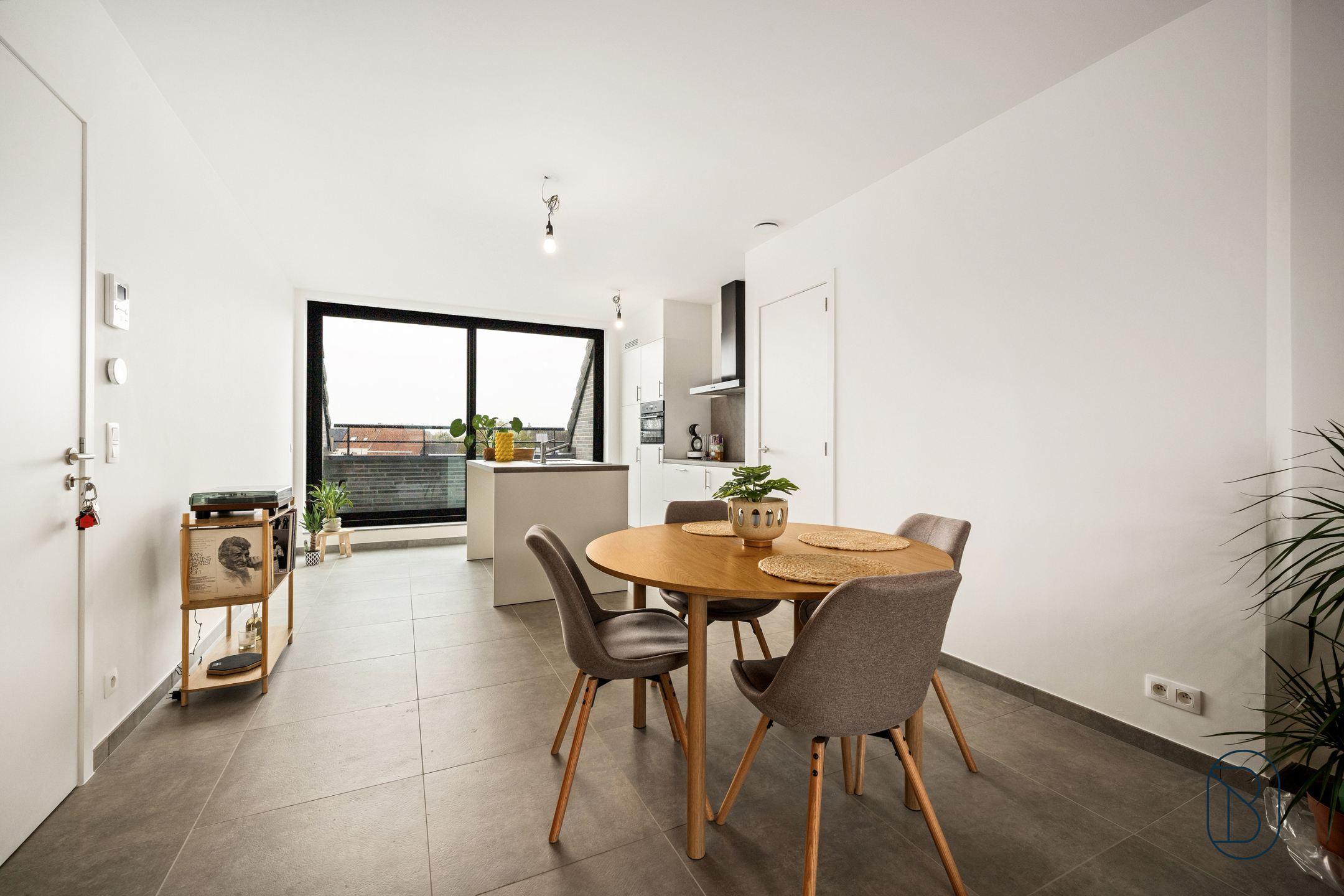 Ce duplex agréable dispose d'un espace de vie lumineux avec cuisine ouverte et accès direct à deux terrasses ensoleillées, l'une à l'avant et l'autre à l'arrière. À ce niveau, vous trouverez également des toilettes séparées et un débarras pratique.