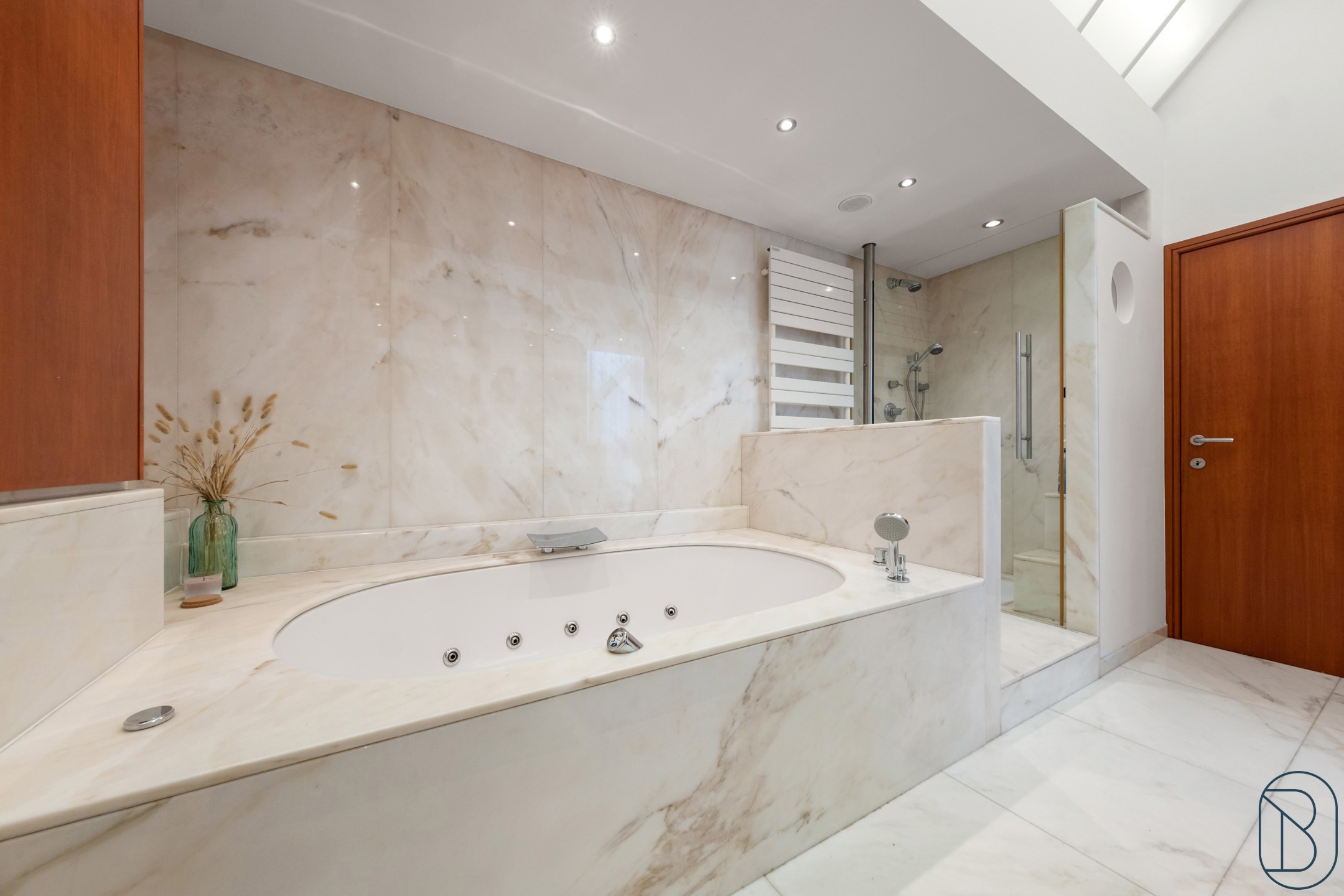 La partie habitation comprend un séjour lumineux avec un espace bureau donnant accès au jardin, une cuisine entièrement équipée avec buanderie attenante et toilettes séparées. À l'étage, on trouve 4 grandes chambres, un dressing, une salle de bain avec douche et baignoire (marbre). Grand grenier pouvant être aménagé en chambre supplémentaire. Jardin ensoleillé avec cour intérieure et terrasse couverte. EMPLACEMENT DE CHOIX.