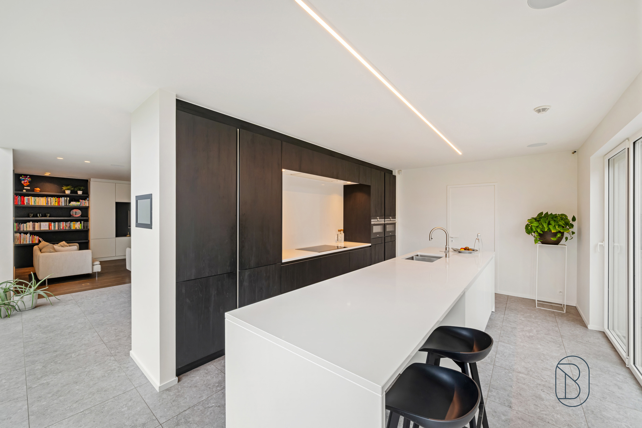 De lichtrijke leefruimte met parket zorgt voor een warme sfeer en wordt aangevuld met een volledig uitgeruste keuken met hoogwaardige toestellen.