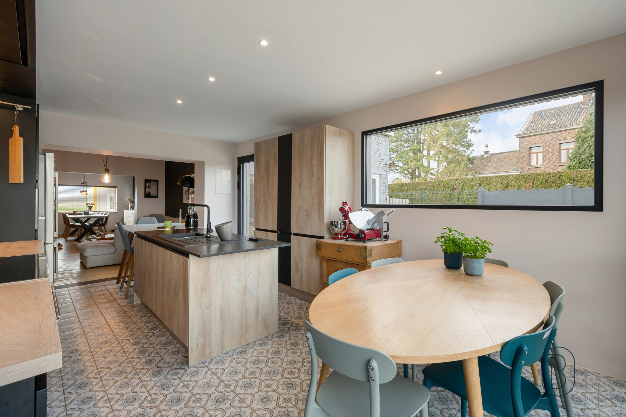 Lichtrijke leefruimte met warme parketvloer en hoogwaardige afwerking. In de nieuwe aanbouw (2025) bevind zich de volledig geïnstalleerde keuken met praktisch keukeneiland is uitgerust met stoomoven, dubbele oven, vaatwasser en een Amerikaanse koelkast met wijnkoeler en ijsmaker. De Marokkaanse tegeltjes als splashwand geven extra karakter.