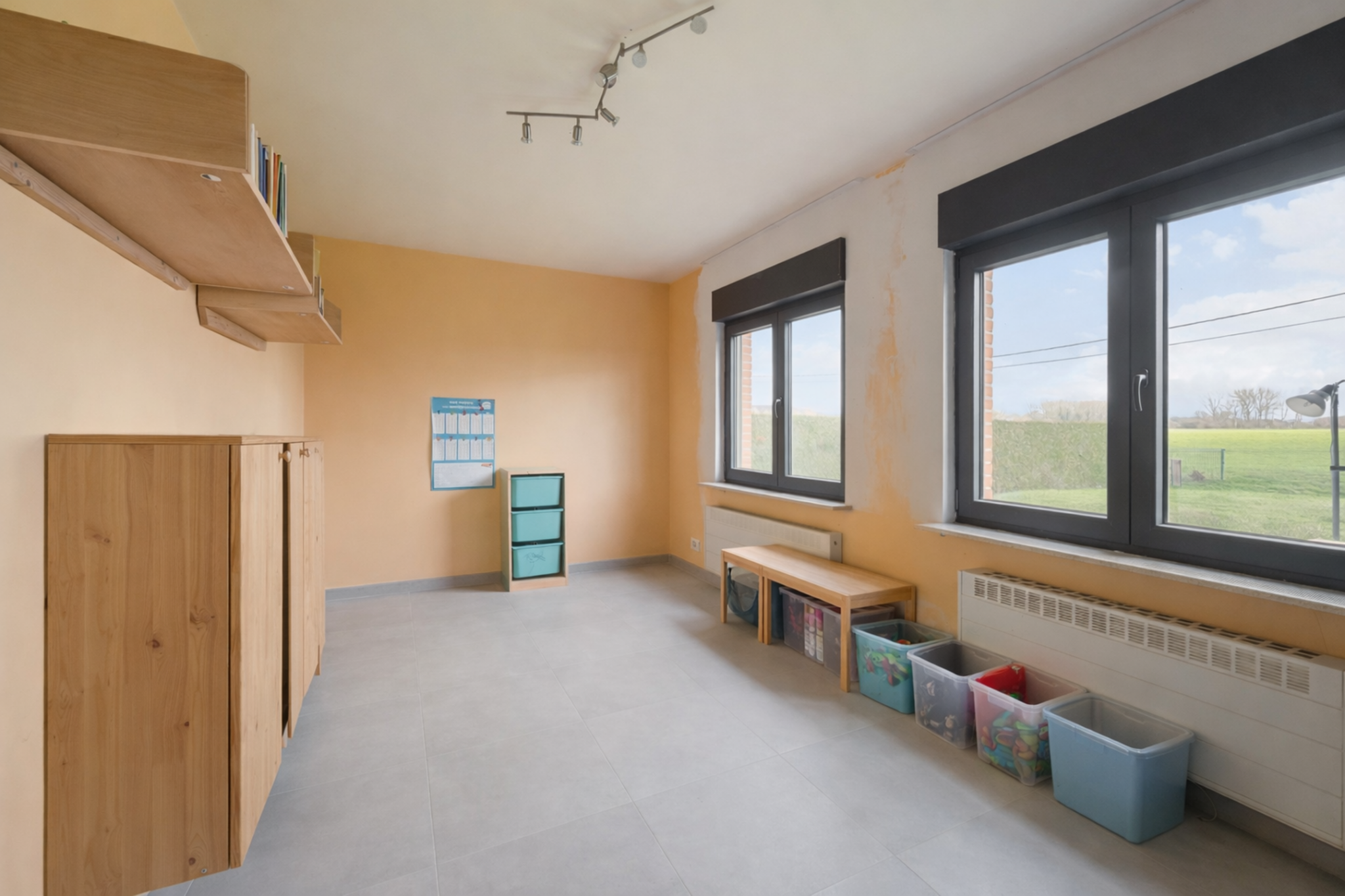 Indeling gelijkvloers: ruime inkomhal met apart gastentoilet, lichtrijke leefruimte met haardvuur, volledig geïnstalleerde keuken, technische ruimte/wasplaats, een bureau en een aparte speelkamer of polyvalente ruimte.