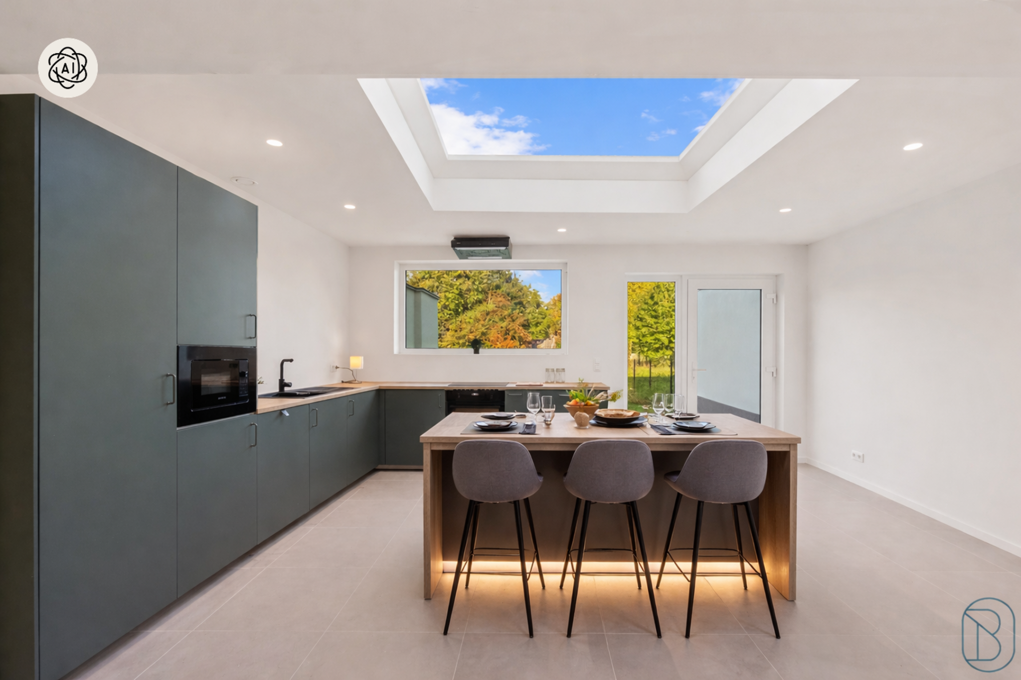 Inkomhal met apart toilet, gezellige zithoek en een ruime open, volledig geïnstalleerde keuken die uitgeeft op de tuin. Verder zijn er een berging/wasplaats en een ruime kelder (±30 m²).
