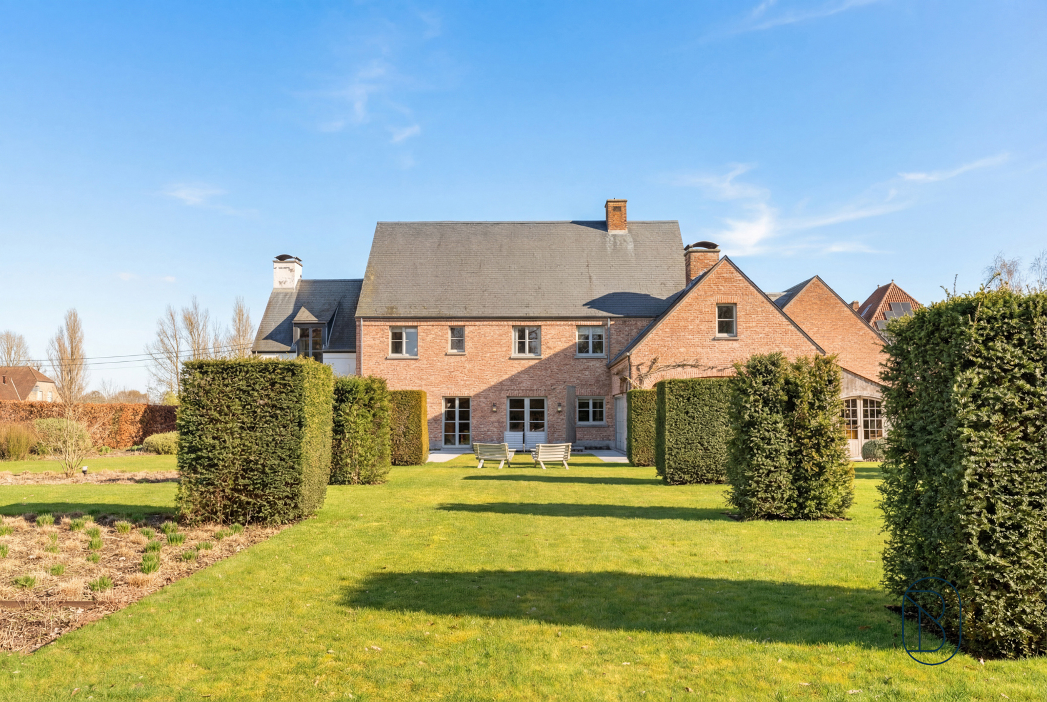 indrukwekkende inkomhal met prachtige trap, bureau, apart toilet en vestiaire, gezellige grote leefruimte (mooie schouw, parket, extra bureau), geïnstalleerde keuken met extra ontbijthoek, grenzend aan de orangerie (bar, open haard) met uitzicht op terras en tuin, extra bijkeuken en wasplaats (met koelcel); extra toilet, 3 garages (overzolderd).