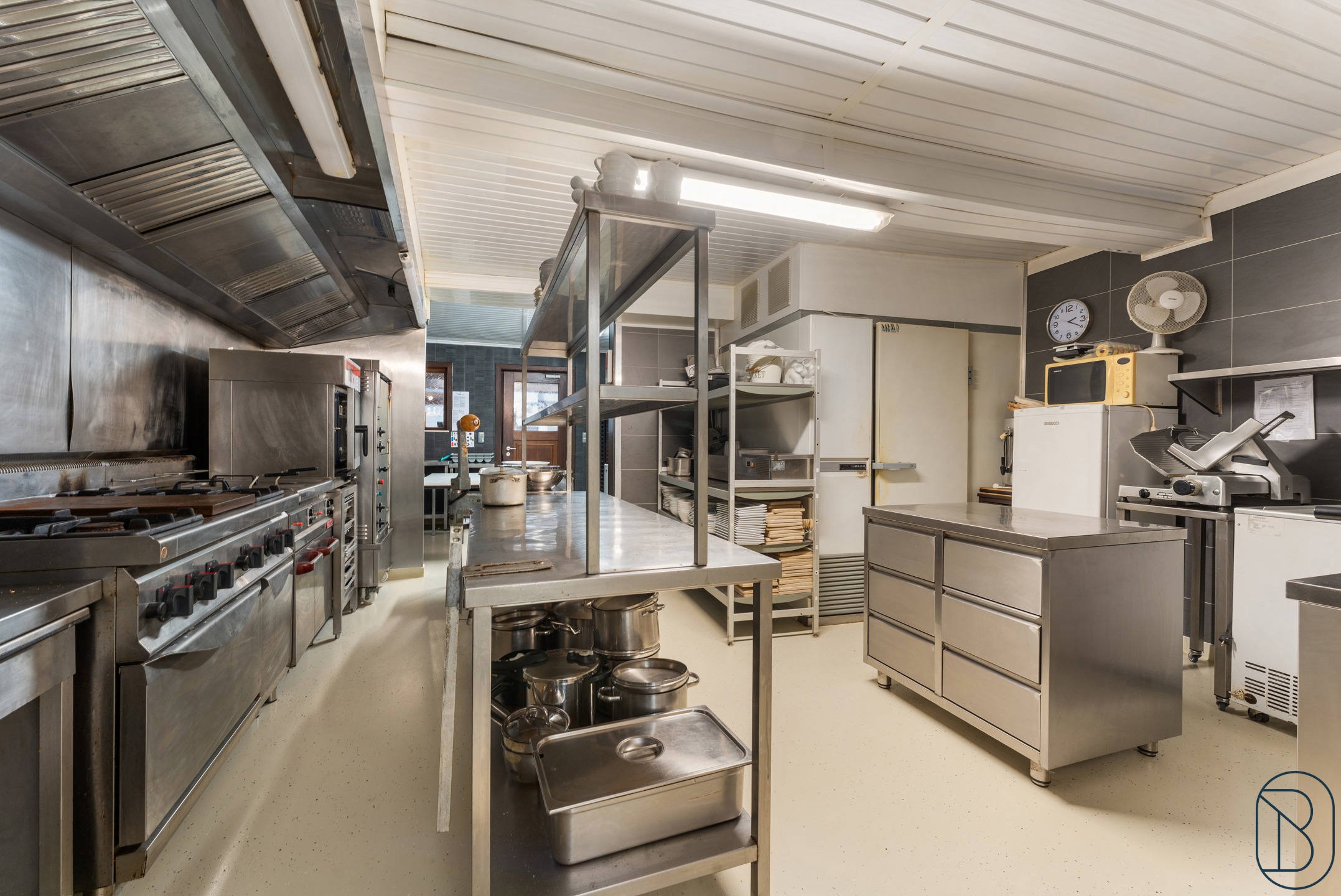 Indeling: inkomhal, aparte toiletten, eetzaal (plaats voor 50 personen, volledig uitgeruste en professionele keuken en een aparte feestzaal waar een 70-tal personen kunnen tafelen.