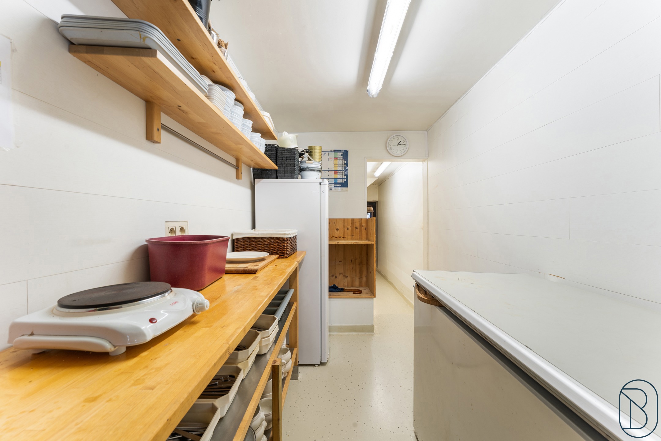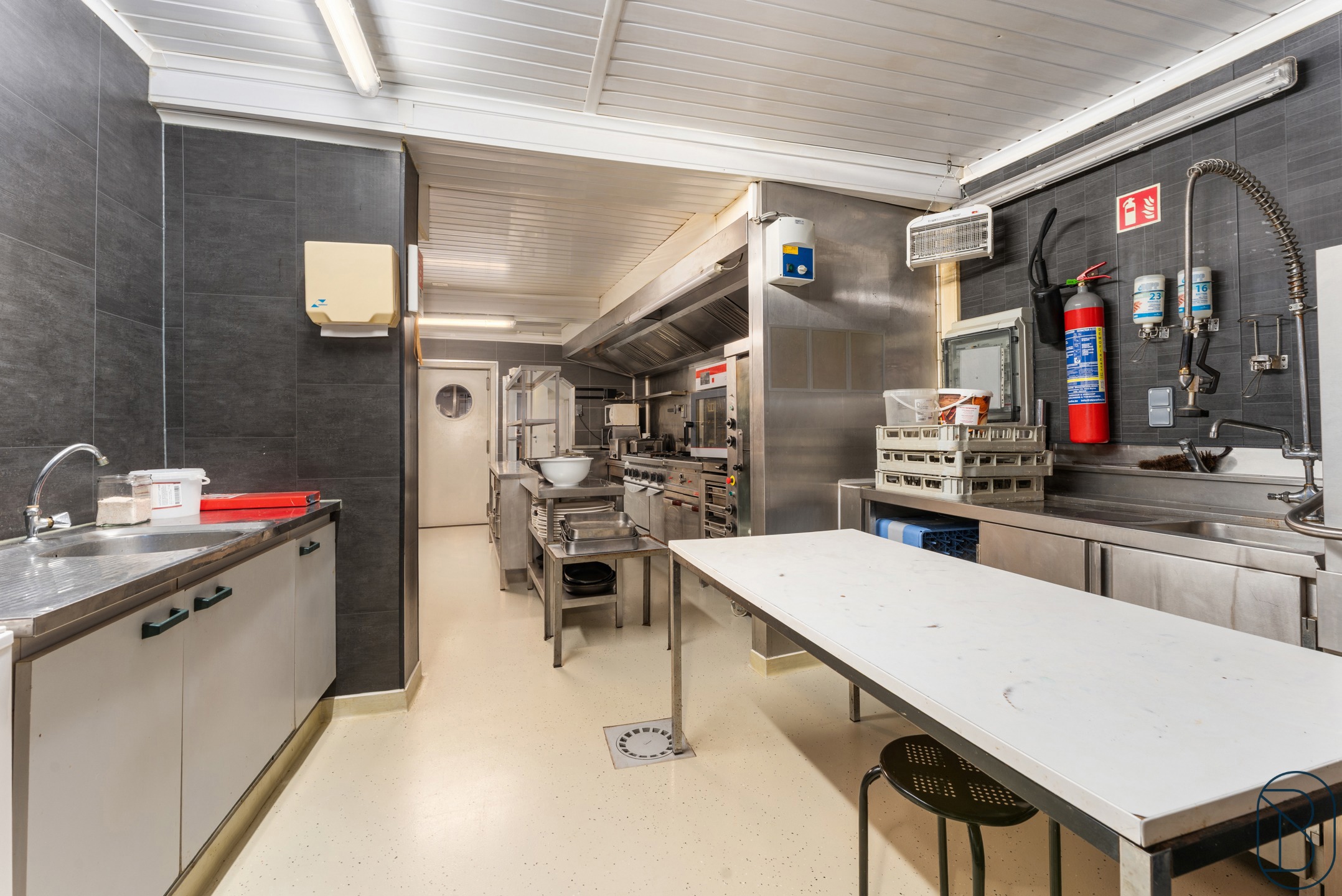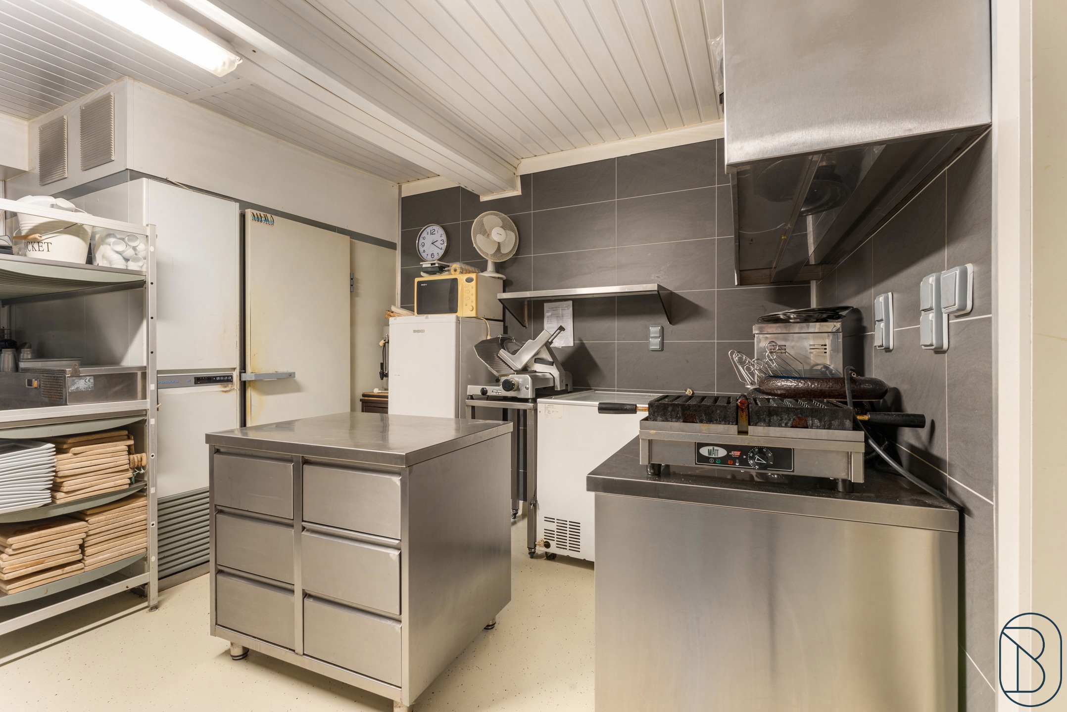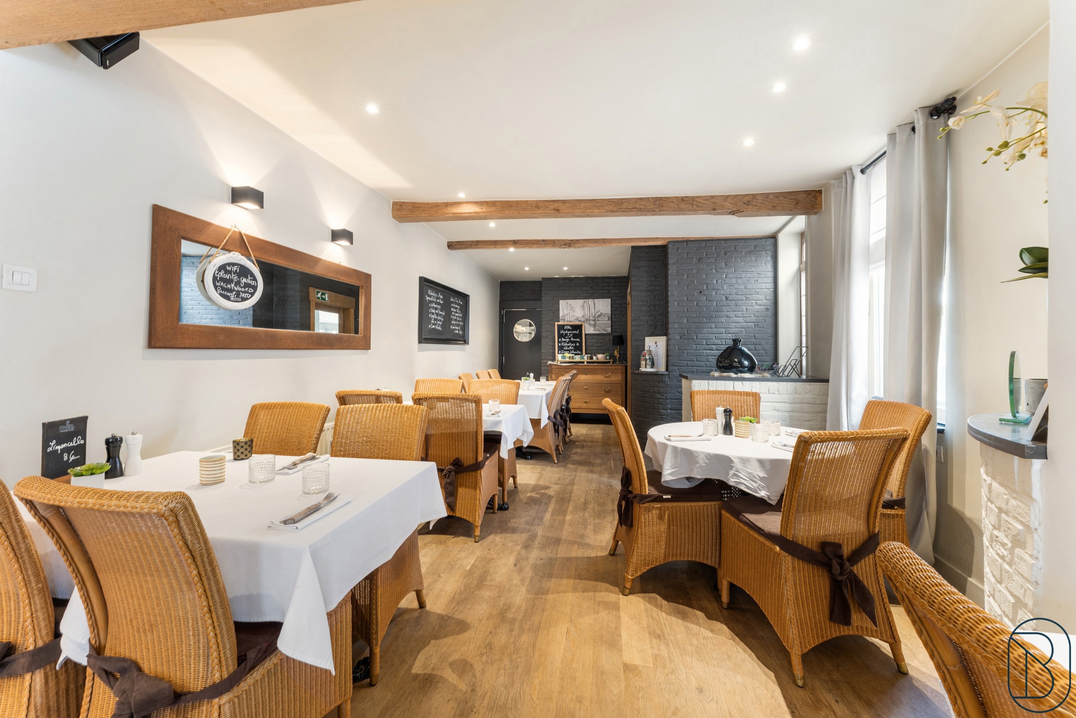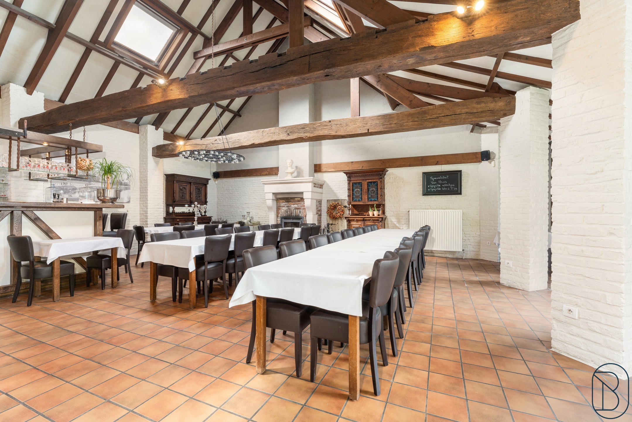 Indeling: inkomhal, aparte toiletten, eetzaal (plaats voor 50 personen, volledig uitgeruste en professionele keuken en een aparte feestzaal waar een 70-tal personen kunnen tafelen.