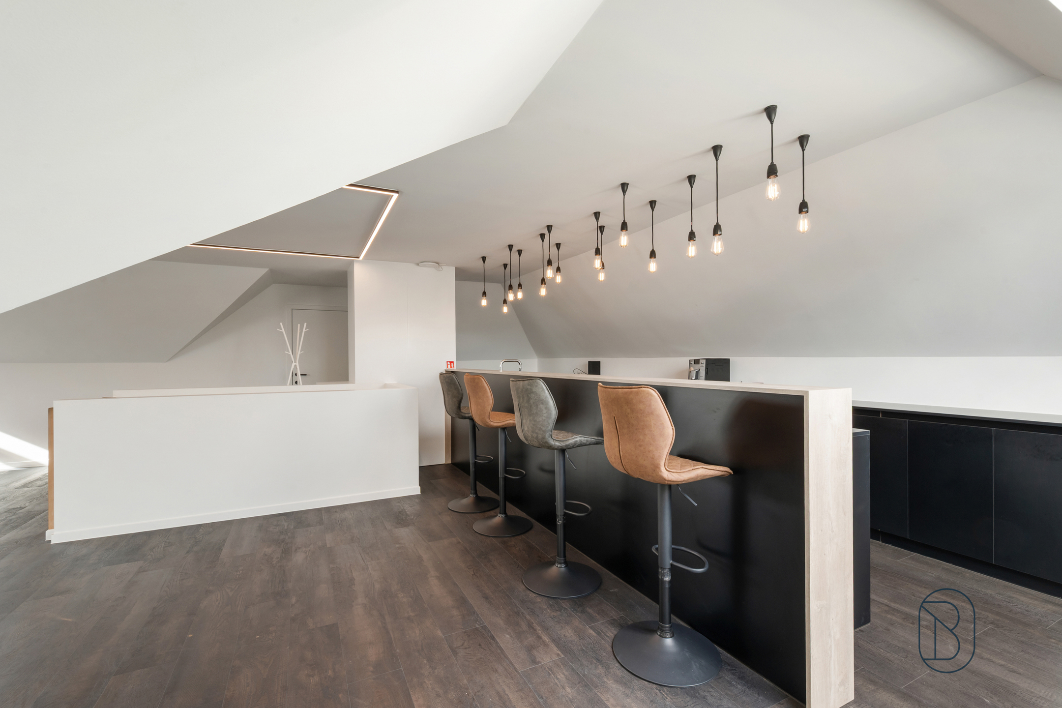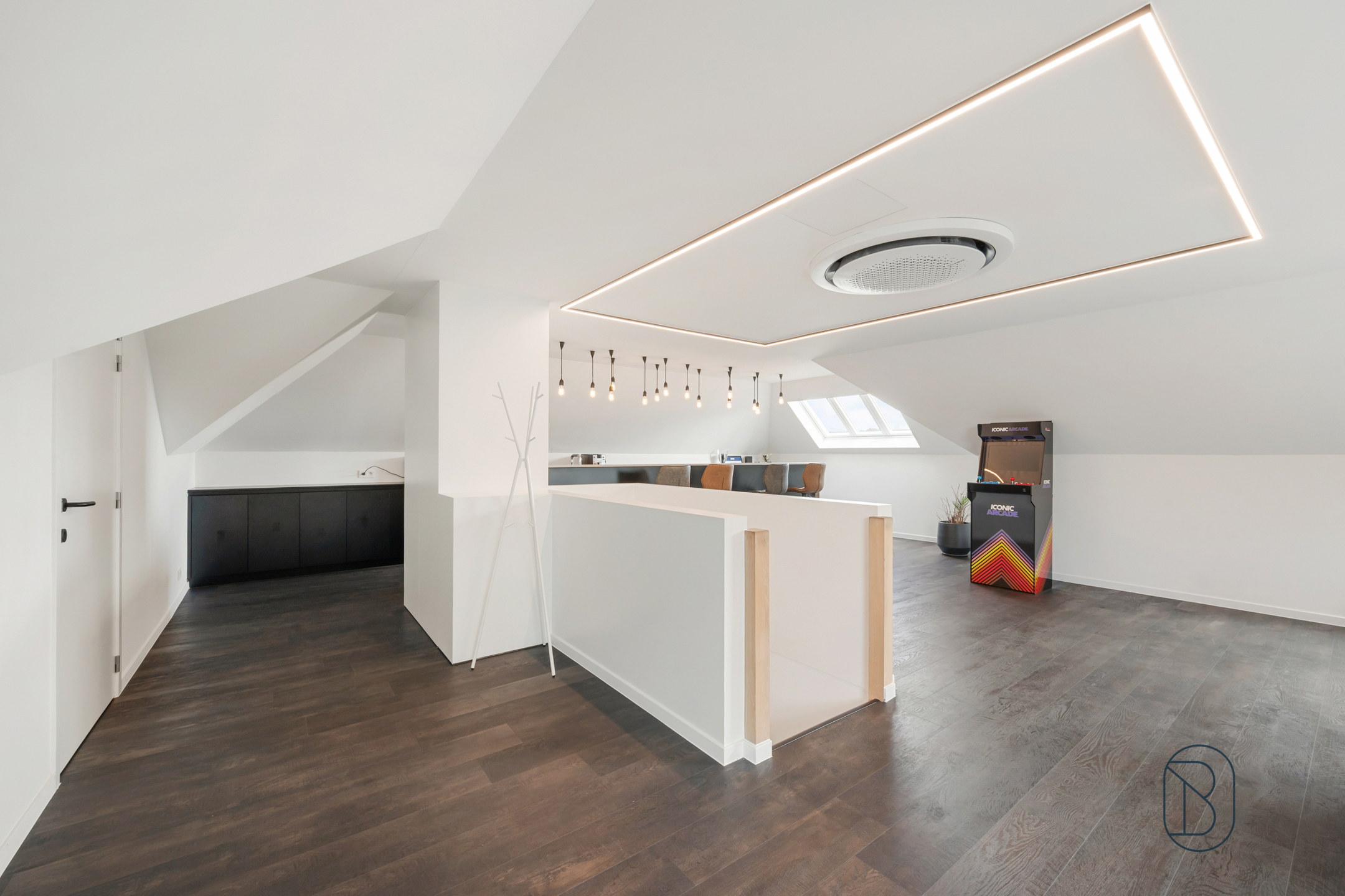 Op het verdiep werd een grote polyvalente ruimte met bar voorzien + extra berging/zolderruimte.