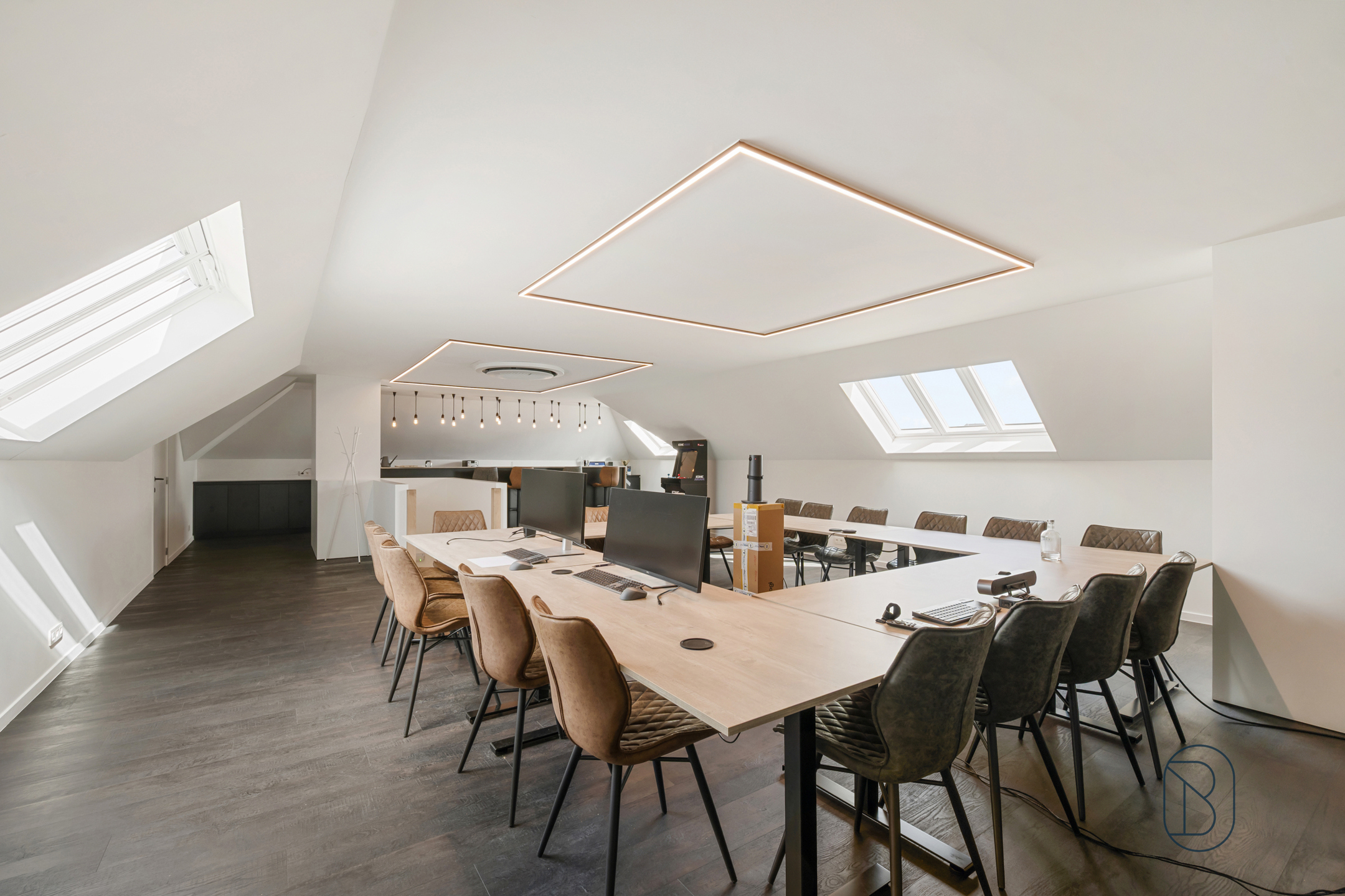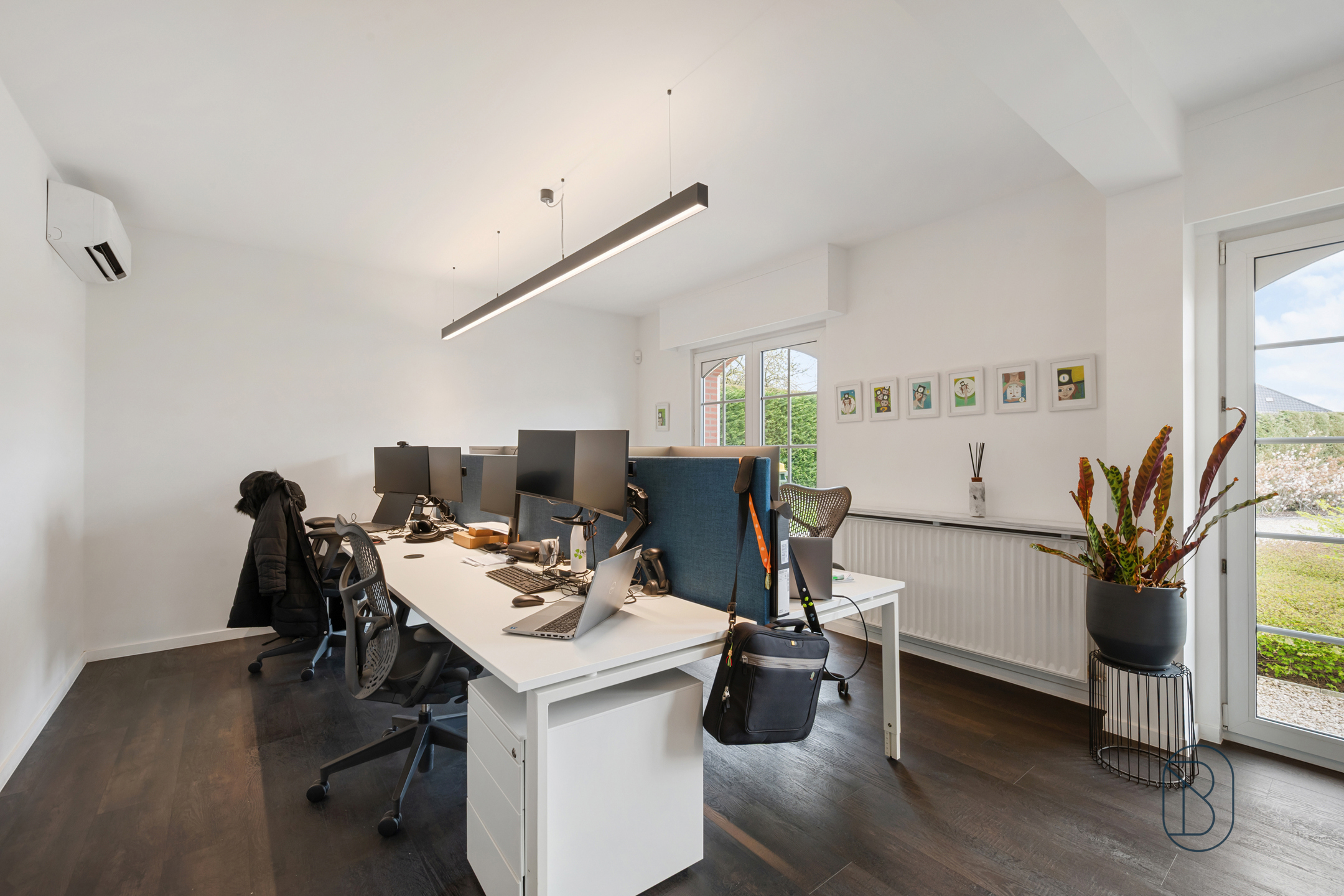 Indeling: inkom met gastentoilet, een eerste vergaderruimte, grote werkruimte met aansluitend de geïnstalleerde keuken die uitgeeft op terras en tuin, 2 extra kantoorruimtes/burelen, badkamer, en sanitaire voorzieningen. Grote dubbele garage die extra mogelijkheden biedt (ideale opslag of als extra werkruimte). Handige kelder.