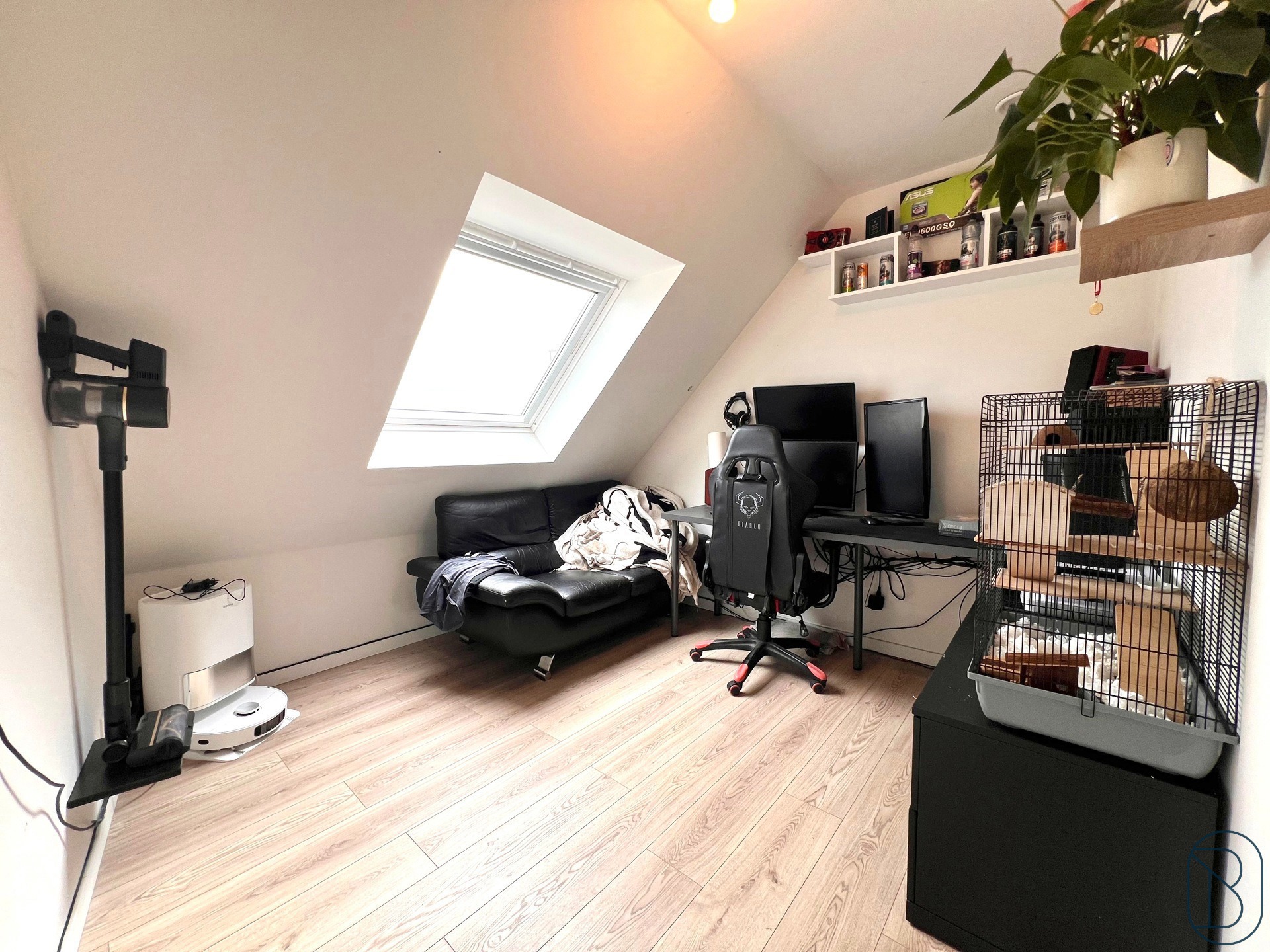 INDELING: inkomhal met apart gastentoilet, lichtrijke leefruimte met open keuken, handige opbergzolder, badkamer (dubbele lavabo en douche) en 2 volwaardige slaapkamers.