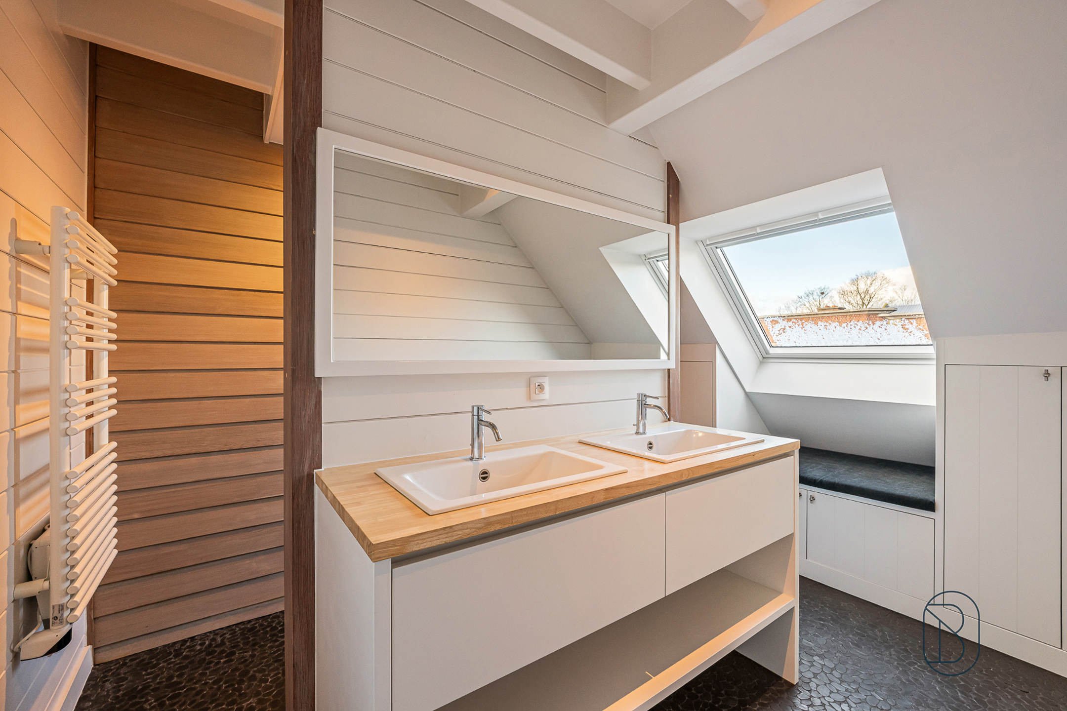 Het appartement beschikt over twee slaapkamers en twee badkamers, wat zorgt voor een praktische en aangename indeling. De woonruimtes zijn afgewerkt met hoogwaardige materialen en voorzien van ingebouwde kasten. Een absolute meerwaarde is het terras met open zicht over de binnenstad. De vloerverwarming op aardgas onderstreept het hedendaagse en energiezuinige karakter van het appartement.