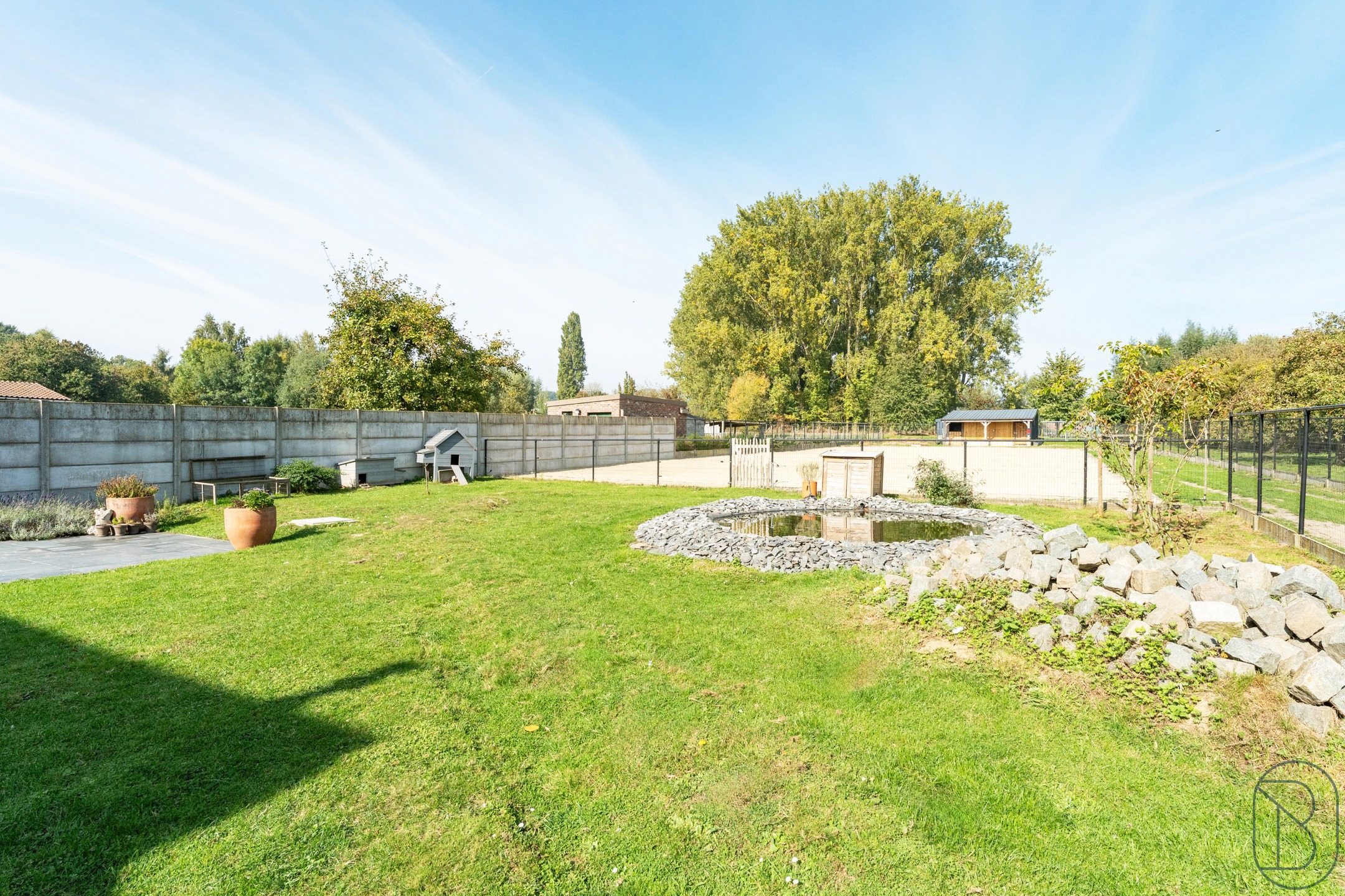 Terras en grote tuin met zicht op groen, paardenstallen, paddock voor paarden (niet vergund): los zand over teelaarde.
