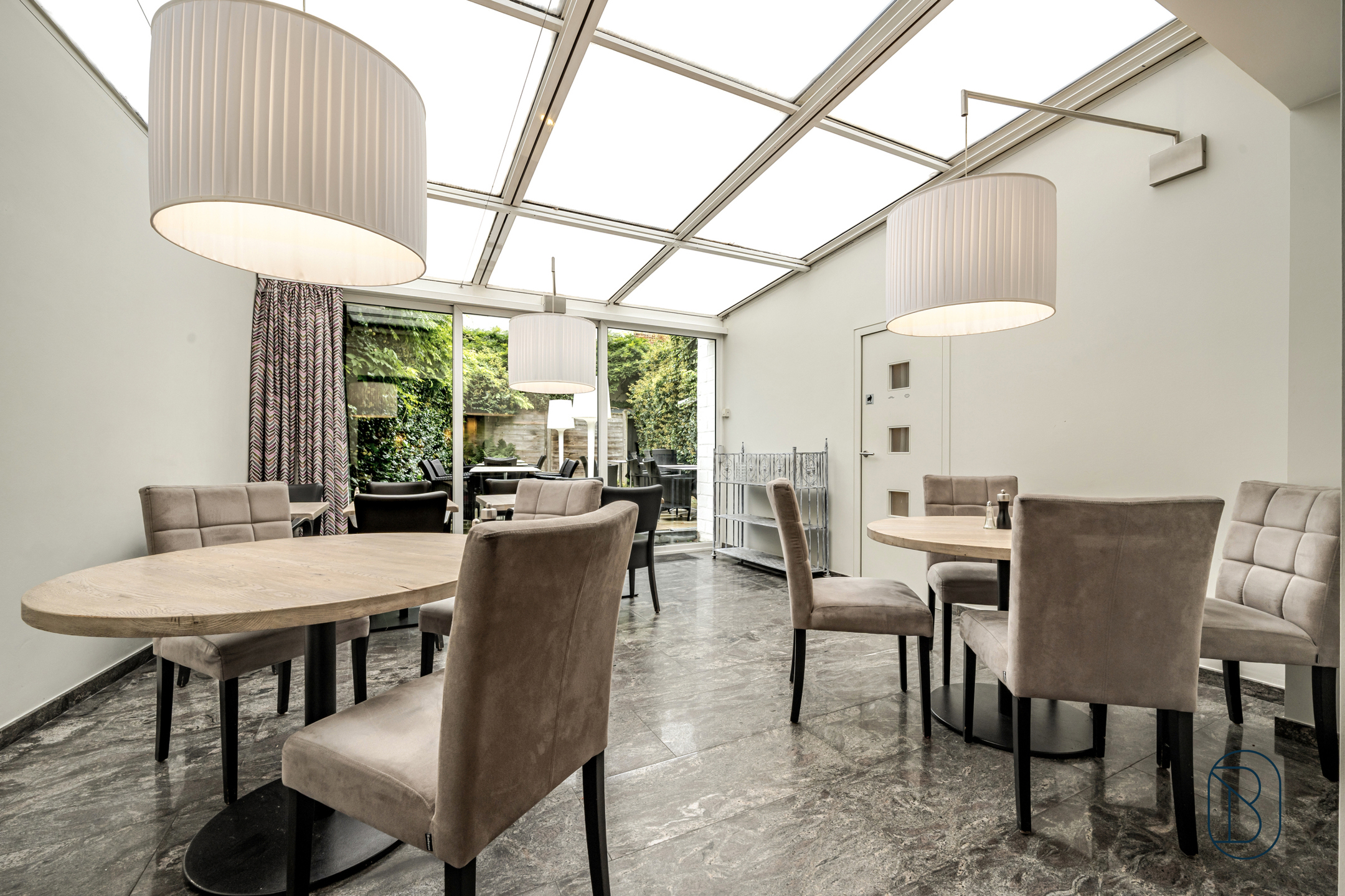 Indeling: inkom met vestiaire, handelsruimte met ruime bar, veranda, toiletten, ingesloten terras, grote professionele keuken met afwasruimte, koelruimte, groot fornuis, salamander, friteuze, snijmachine, 2 verwarmkasten, eiland met opbergruimte (saladbar, frigo's en frigolades), combi-oven,... bijkeuken in inox. Alle toestellen zijn inbegrepen!