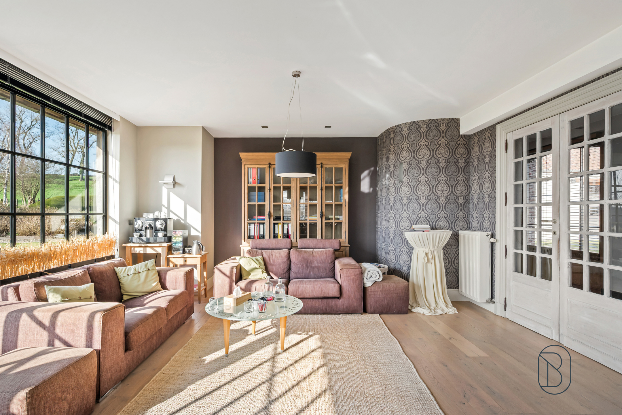 Een absolute blikvanger is de polyvalente ruimte met open haard, gepolierde betonvloer en een indrukwekkend zichtbaar dakgebinte. Dankzij de directe toegang tot de terrassen vormt deze ruimte de perfecte setting voor bijeenkomsten, seminaries of feestelijke momenten.