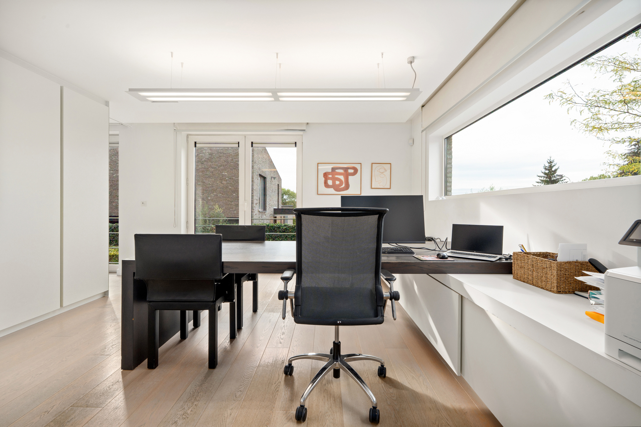 Op het gelijkvloers: inkom en traphal met vestiaire en toilet, grote lichtrijke leefruimte, aparte bureau, geïnstalleerde keuken met ontbijthoek, extra diningroom met zicht op de tuin, overdekt terras, grote dubbele garage, bijkeuken en wasplaats.