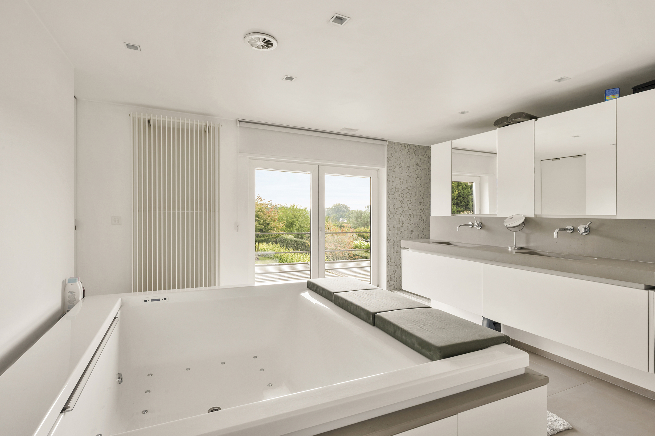 Volledig onderkelderd: prachtig nieuw binnenzwembad, bar/mancave en wijnfrigo, wellness: sauna en stoomdouche, en een sportruimte, aanpalend buiten terras met jacuzzi.